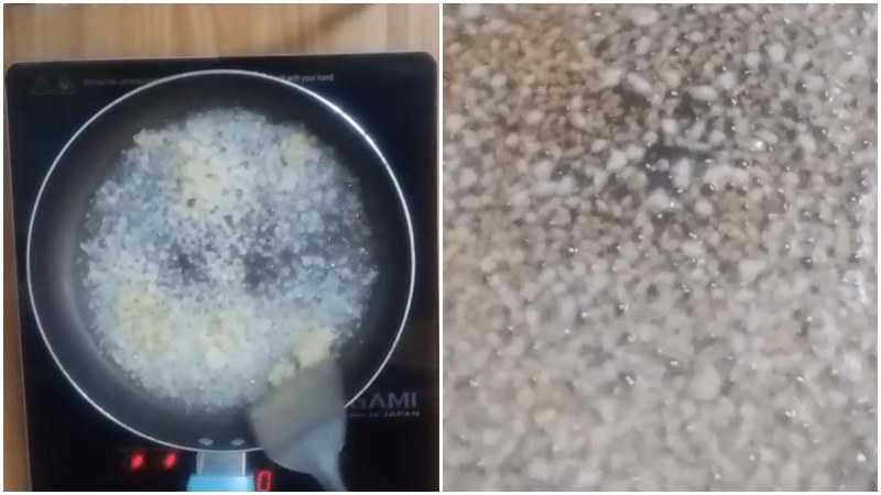 Sau khi đã hoàn tất phần hành phi, bạn chuẩn bị một chảo sạch khác để tiếp tục phi tỏi. Đặt chảo lên bếp, cho vào khoảng năm muỗng canh dầu ăn, bật lửa vừa và đợi đến khi dầu bắt đầu nóng lên nhẹ. Khi thấy dầu có dấu hiệu lăn tăn, bạn cho toàn bộ phần tỏi đã băm nhuyễn vào.