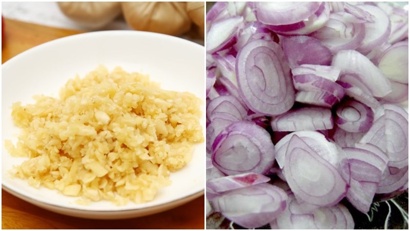 Với hành tím và tỏi, bạn lột sạch vỏ, rửa sơ nếu cần. Hành tím được thái lát thật mỏng để khi phi sẽ giòn, thơm mà không bị đắng. Tỏi thì băm nhuyễn để khi xào cùng sa tế sẽ dậy mùi và hoà quyện đều vào nước trộn bánh sau này.