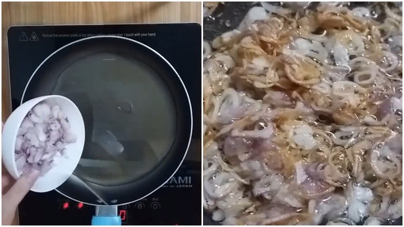 Tiếp theo, cho toàn bộ phần hành tím đã thái lát vào chảo, dùng đũa đảo đều tay để hành được tơi và tiếp xúc đều với dầu. Phi hành từ bảy đến mười phút cho đến khi hành dần chuyển sang màu vàng nhạt và bắt đầu tỏa hương thơm rõ rệt thì tắt bếp. Lúc này, bạn nhanh tay vớt hành ra, để vào rây hoặc chén có lót giấy thấm dầu để giữ được độ giòn.