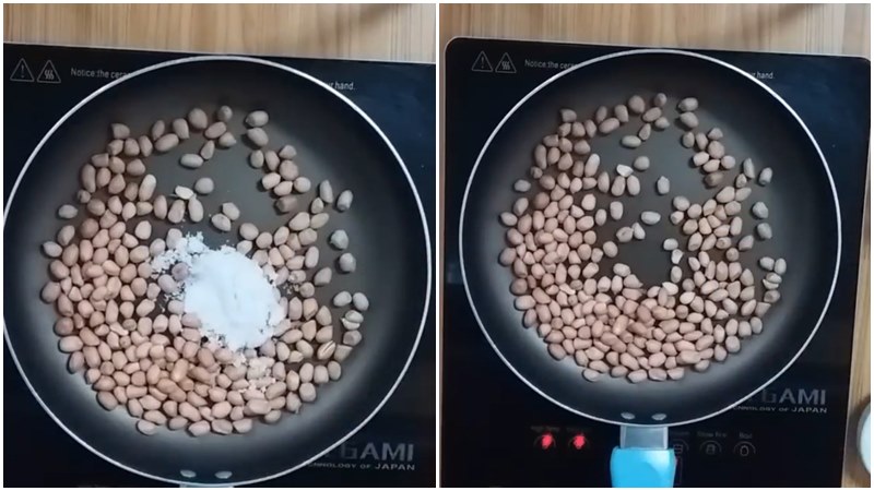 Bạn tiếp tục sử dụng một chiếc chảo khác, đặt lên bếp và cho vào khoảng một trăm gram đậu phộng cùng với ba muỗng canh muối hạt. Bật lửa nhỏ và tiến hành rang đều tay trong khoảng mười đến mười ba phút để đậu chín từ từ mà không bị khét vỏ ngoài.