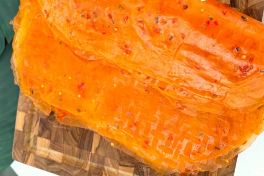 Bánh tráng dẻo tôm là món ăn vặt được nhiều người yêu thích nhờ độ dẻo tự nhiên cùng hương vị đậm đà khó quên. Khác với bánh tráng cuốn truyền thống, loại bánh này không cần nhúng nước mà có thể ăn liền ngay sau khi mở gói, vô cùng tiện lợi. Lớp bánh mềm dẻo vừa phải, không bị quá dai hay cứng. Điều đặc biệt nằm ở vị tôm được tẩm ướp khéo léo, hòa quyện giữa vị mặn, ngọt và một chút cay nhẹ, kích thích vị giác.
